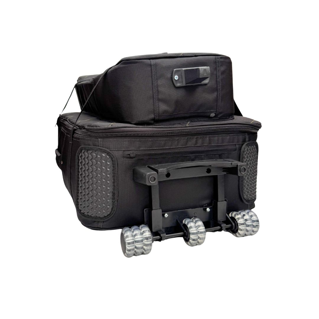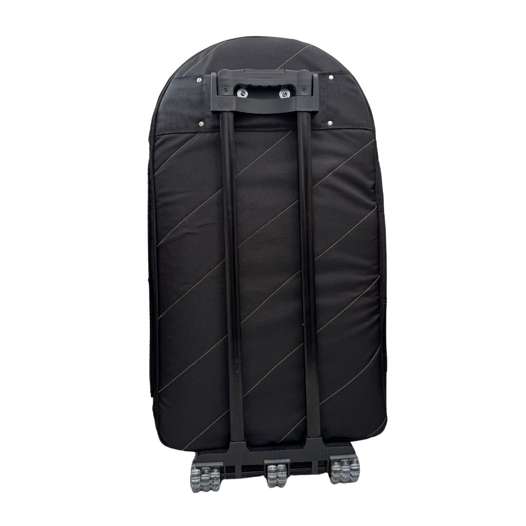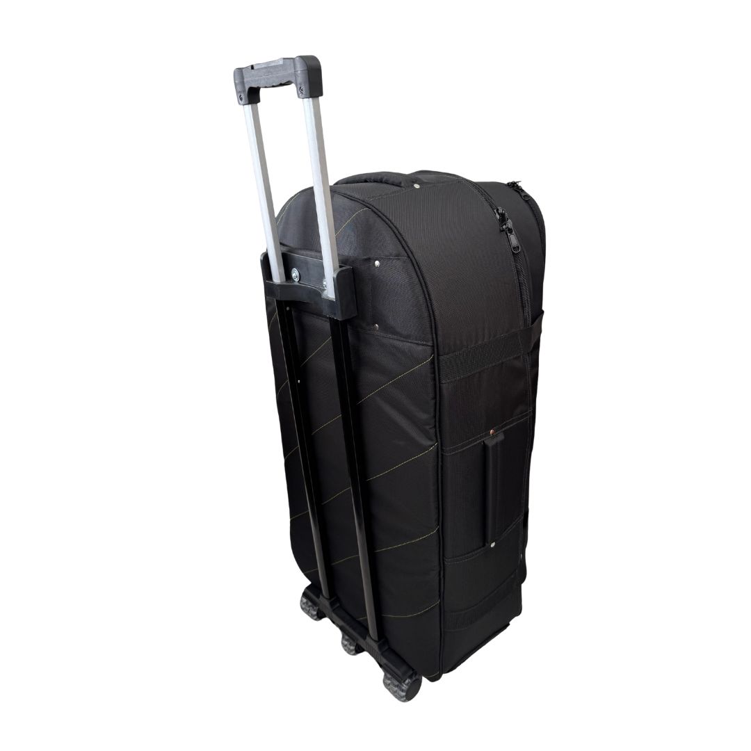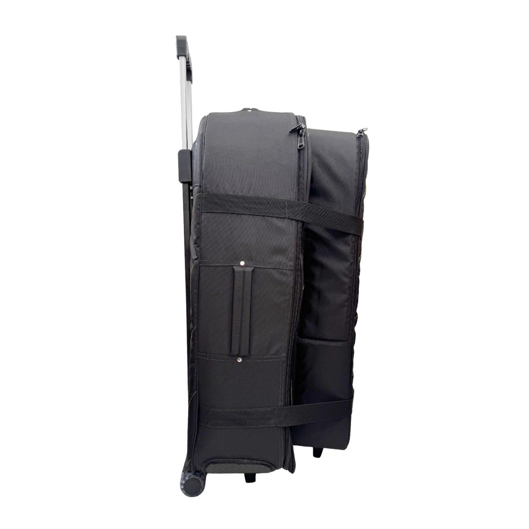 Su bolsillo interno acolchado permite transportar platos de hasta 16 pulgadas, mientras que su amplio bolsillo externo para herrajes ayuda a llevar el set de forma mucho más práctica y organizada. Además, incorpora un sistema de carrito con rodachines y manija extendible, reforzado internamente con madera para soportar mejor la carga y brindar una movilidad superior.