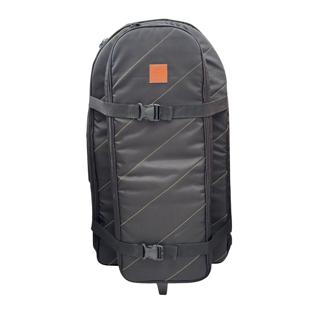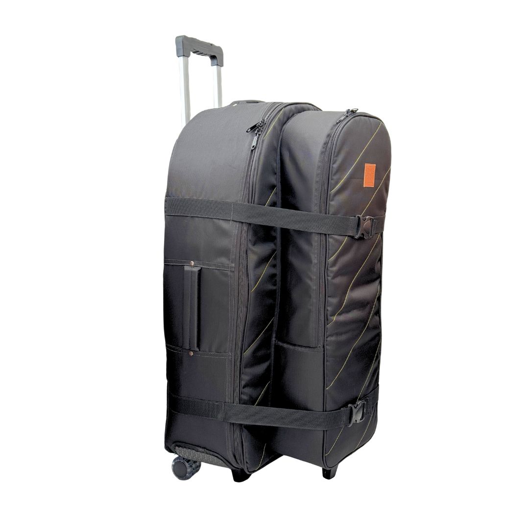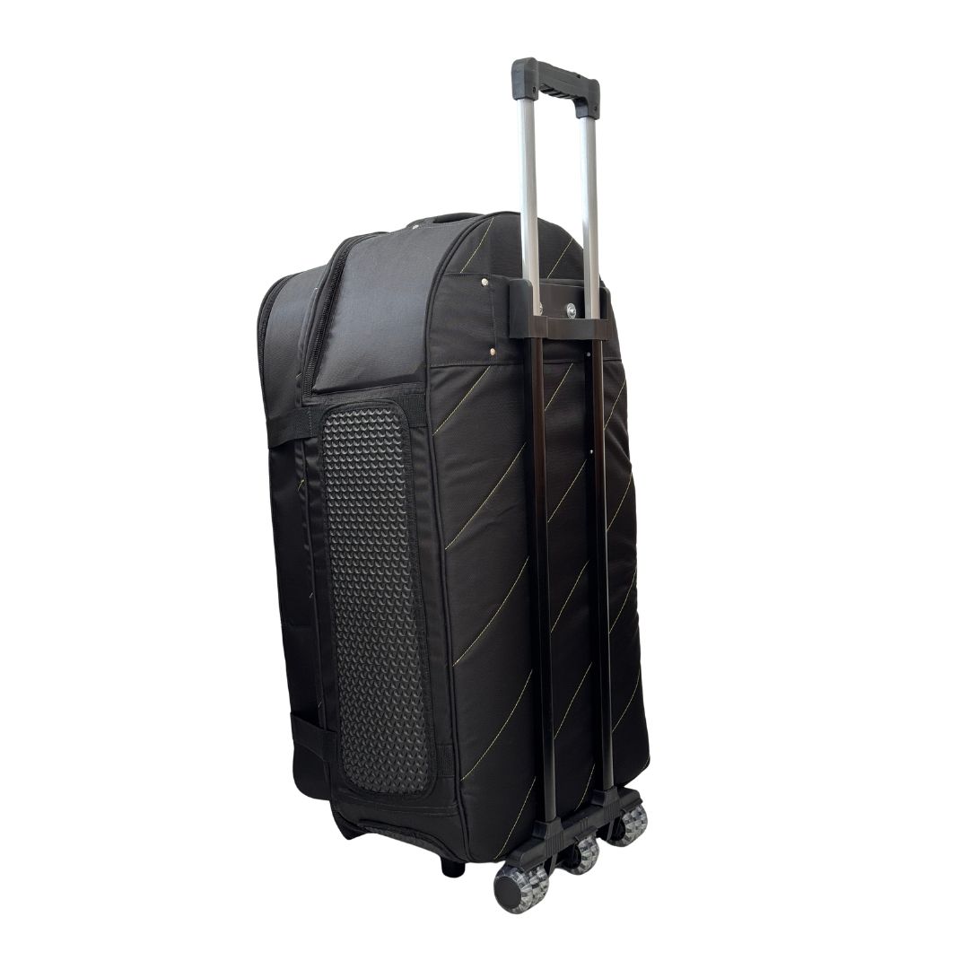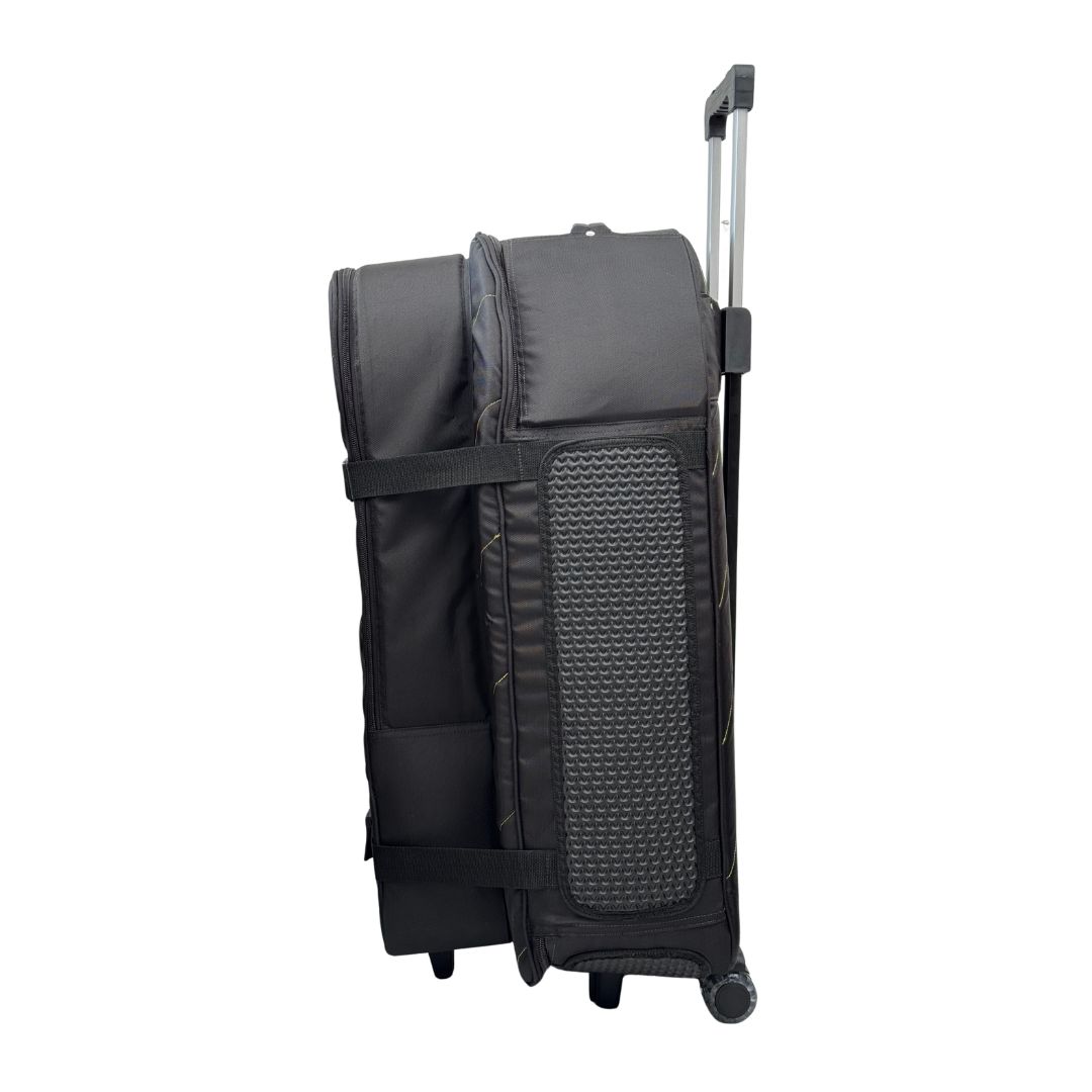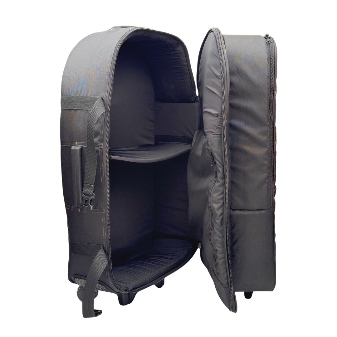 Su bolsillo interno acolchado permite transportar platos de hasta 16 pulgadas, mientras que su amplio bolsillo externo para herrajes ayuda a llevar el set de forma mucho más práctica y organizada. Además, incorpora un sistema de carrito con rodachines y manija extendible, reforzado internamente con madera para soportar mejor la carga y brindar una movilidad superior.